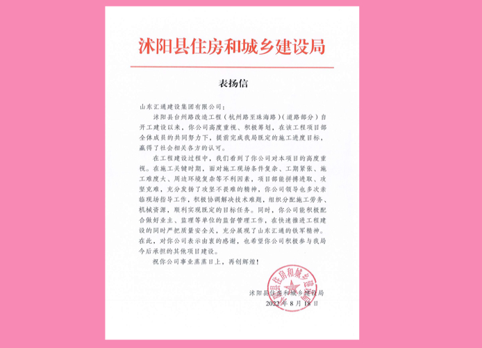 近日,沭陽縣住房和城鄉(xiāng)建設(shè)局向匯通公司發(fā)來表揚信,對沭陽縣臺州路改造工程項目部面對工期緊、管線障礙多、周邊環(huán)境復(fù)雜等不利因素,科學(xué)調(diào)度周密組織,嚴(yán)把工程質(zhì)量安全關(guān),提前完成進度目標(biāo)給予高度肯定。