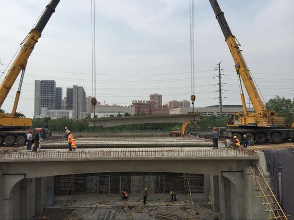 5月18日上午9時,濱河南路拓寬改造工程第一塊T型板梁正式開始吊裝。該橋設(shè)計寬26米,橋跨18米,橋型為一跨簡支變截面肋梁橋,主梁采用裝配式后張預(yù)應(yīng)力混凝土變截面T梁,吊裝后濕接。經(jīng)過連續(xù)不間斷作業(yè),于下午16時圓滿完成七塊主梁、兩塊邊梁,共計九塊板梁的吊裝任務(wù),比原計劃提前一天,至此標志著橋梁主體結(jié)構(gòu)工程順利完成。