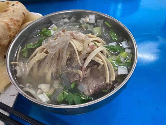 午餐時(shí)間到了。一碗牛肉湯甚是美味,西瓜清涼解渴。