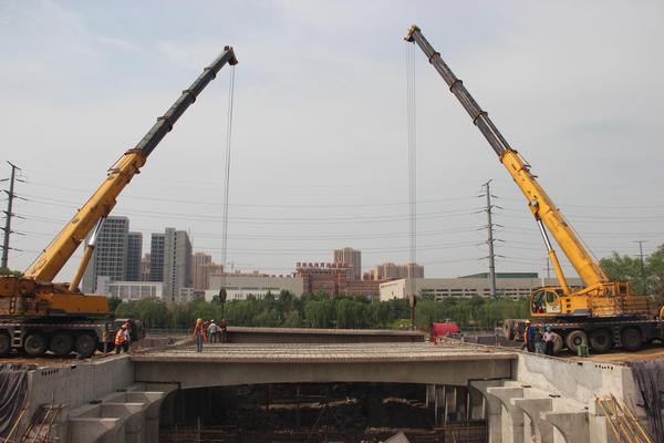 5月18日上午9時,濱河南路拓寬改造工程第一塊T型板梁正式開始吊裝。該橋設(shè)計寬26米,橋跨18米,橋型為一跨簡支變截面肋梁橋,主梁采用裝配式后張預(yù)應(yīng)力混凝土變截面T梁,吊裝后濕接。經(jīng)過連續(xù)不間斷作業(yè),于下午16時圓滿完成七塊主梁、兩塊邊梁,共計九塊板梁的吊裝任務(wù),比原計劃提前一天,至此標志著橋梁主體結(jié)構(gòu)工程順利完成。