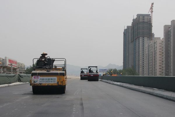 5月8日上午,二環(huán)南(西段)四標進行橋面防水瀝青施工試驗段攤鋪。此次試驗段長260米、寬11.75米,面積3055平方,防水找平層瀝青砂厚2厘米。