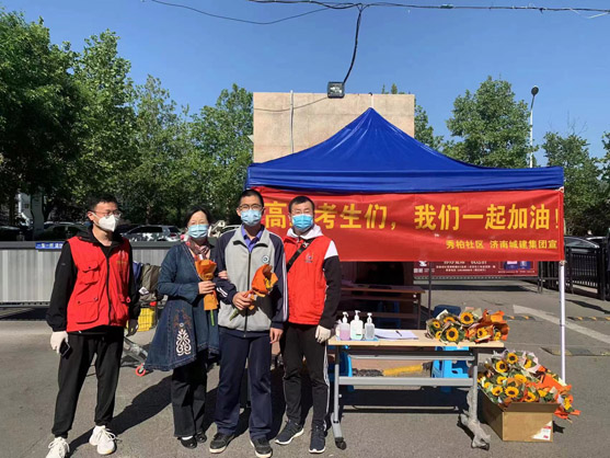 “高三考生們,我們一起加油!” 在領(lǐng)秀城秀柏社區(qū)的防疫志愿服務(wù)站,一條大紅色的條幅,一朵朵象征著太陽與光明、生機與活力的太陽花在陽光的照射下格外絢爛醒目。今天是五一勞動節(jié)也是高三考生因疫情封閉后第一天復(fù)課的日子。 在這個特別的節(jié)日里,領(lǐng)秀城秀柏社區(qū)的防疫先鋒隊第一小組組長榮峰提前一天就定購好了100朵鮮花,一大早,當高三學(xué)生走到小區(qū)門口,志愿者們就將一朵朵鮮艷的太陽花和祝??ㄋ偷綄W(xué)生手中,“想起了向日葵就想起了陽光,微笑和美好常在,我們一起加油!” “叔叔,太謝謝你們了,你們在加班加點為我們服務(wù),還給我們送花,真是讓我倍受鼓舞。”“太感謝你們了,謝謝志愿者們這些日子以來對我們